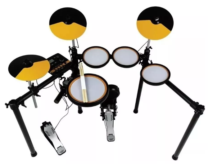 O kit inclui um exclusivo pad de caixa de 12″ com regulagem rápida da tensão da pele, três pads de 9″ (dois pads de tom e um pad de surdo), além de um pad de bumbo robusto e resistente, que é compatível com pedais duplos. Além disso, o kit inclui três pads de prato de 10″ com choke e clamps, e pedais de hi-hat e bumbo.