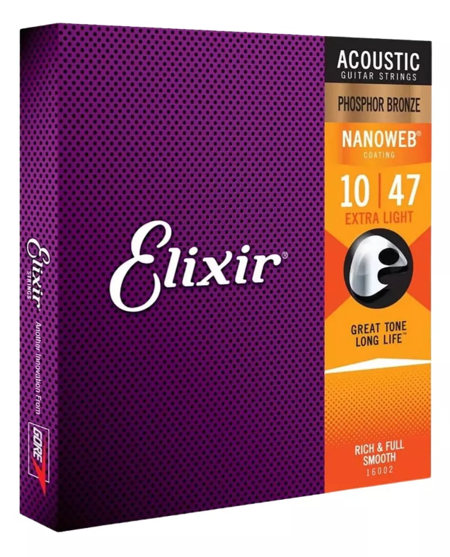 As cordas Elixir® Strings para Violão Aço com revestimento NANOWEB® proporcionam o calor e o brilho característicos do phosphor bronze, aliado à vida útil do timbre estendida.