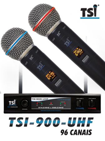 TSI-900-UHF microfone duplo UHF com sincronização automatica de frequência entre o receptor e o transmissor, contendo 96 canais e saídas independentes XLR e MIX P10.